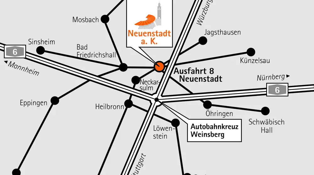 Sie erreichen Neuenstadt am Kocher über die Autobahn A81 Heilbronn-Würzburg. Nehmen Sie die Ausfahrt Nr. 8 Neuenstadt und folgen Sie der Umgehungsstraße L1088 / Industriestraße bis zum ersten Kreisel. Hier fahren Sie in die Lindenstraße und nutzen das kostenlose Parkhaus. Von dort geht es direkt zu unseren Spielstätten und zum Verkaufsbüro.